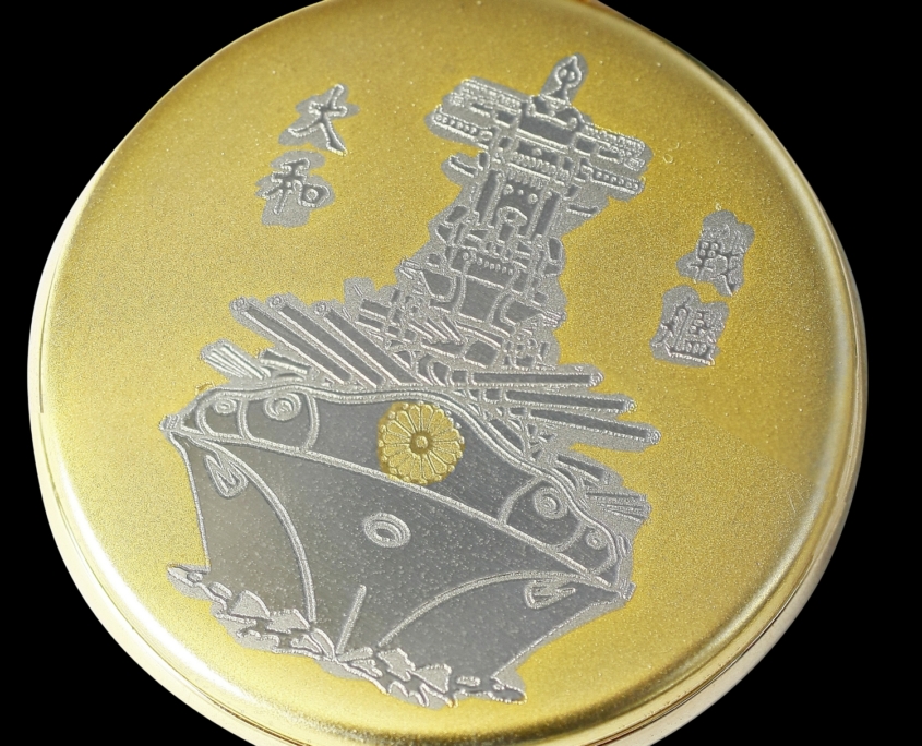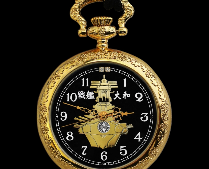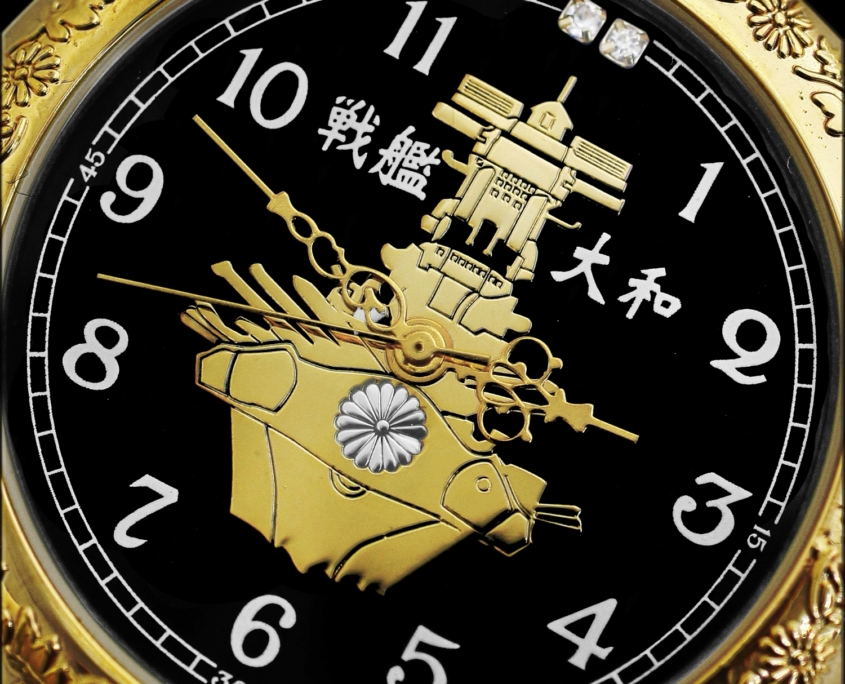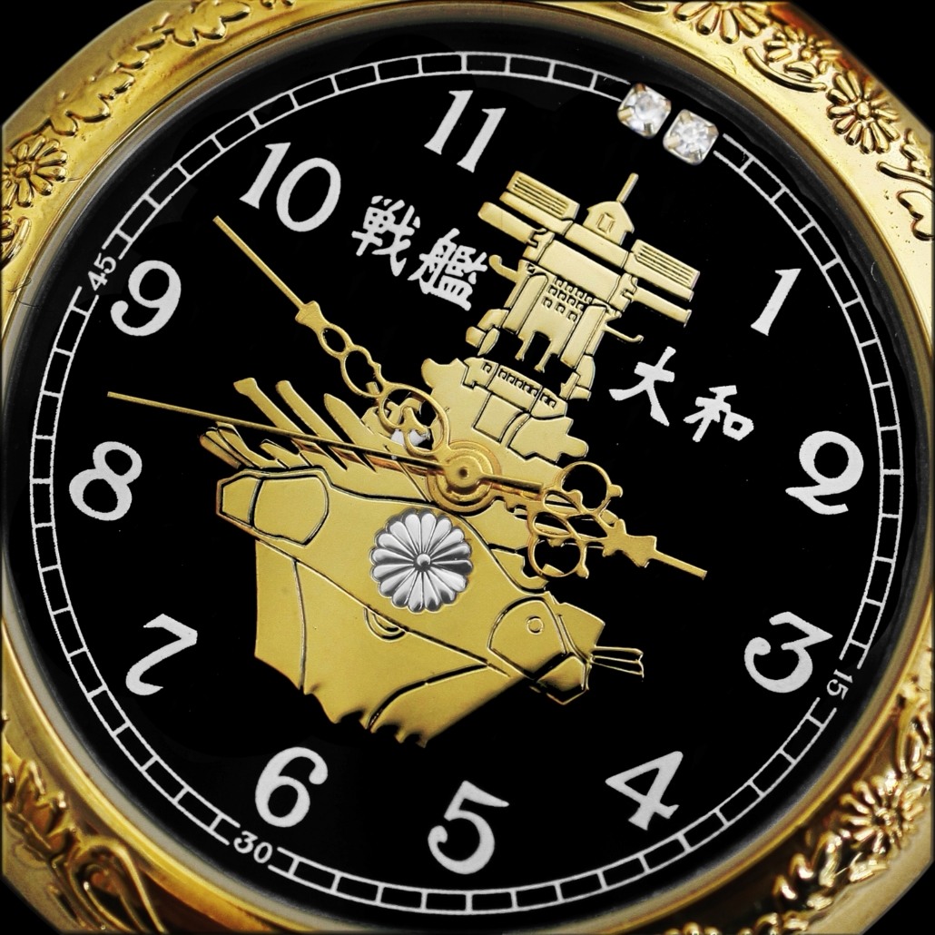 戦艦大和の懐中時計。金色のケースには菊のレリーフで仕立てられ、漆黒に映える文字盤には戦艦大和が刻まれています。12時の方向には天然ダイヤが2つ。 ケースの裏蓋には戦艦大和の雄姿が刻まれています。