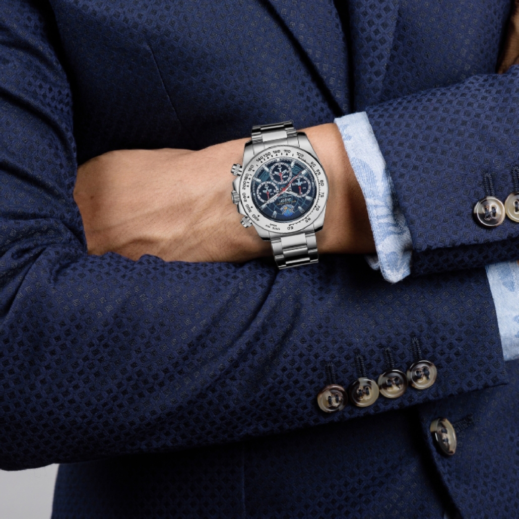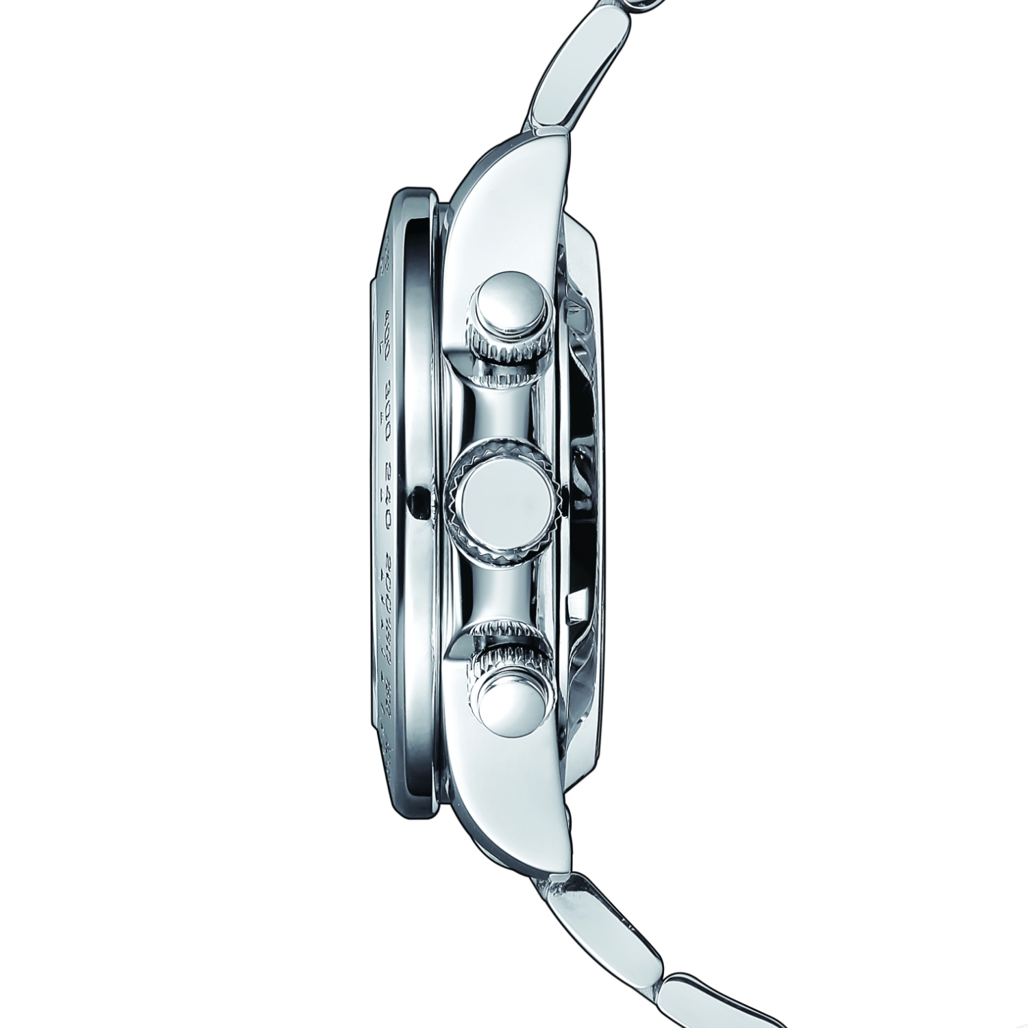 電波を受信して自動的に時刻を合わせ、受けた光を電気エネルギーに変換して動く、手間いらずの電波ソーラークロノグラフ腕時計。4本のベルトをセットしており、気分や装いに合わせて表情を変えて楽しめます。空の過酷な条件下でも実力を発揮しなければならない、まさに隊員のための仕様です。