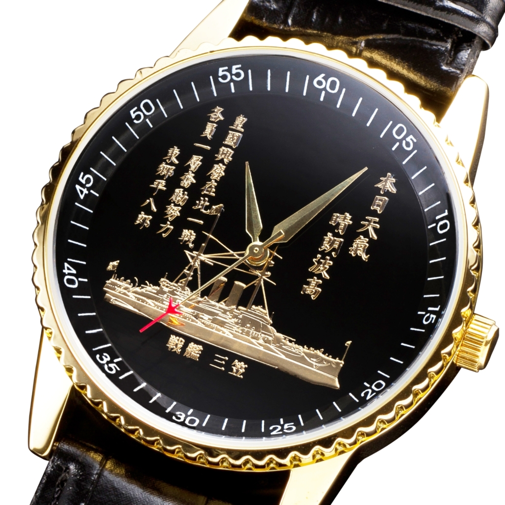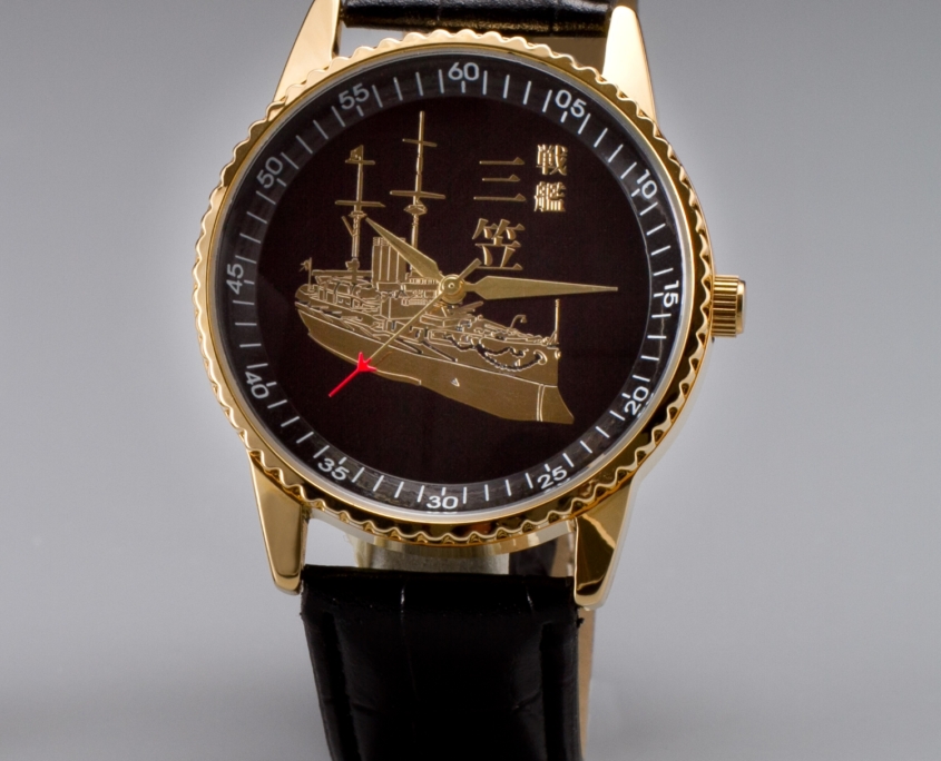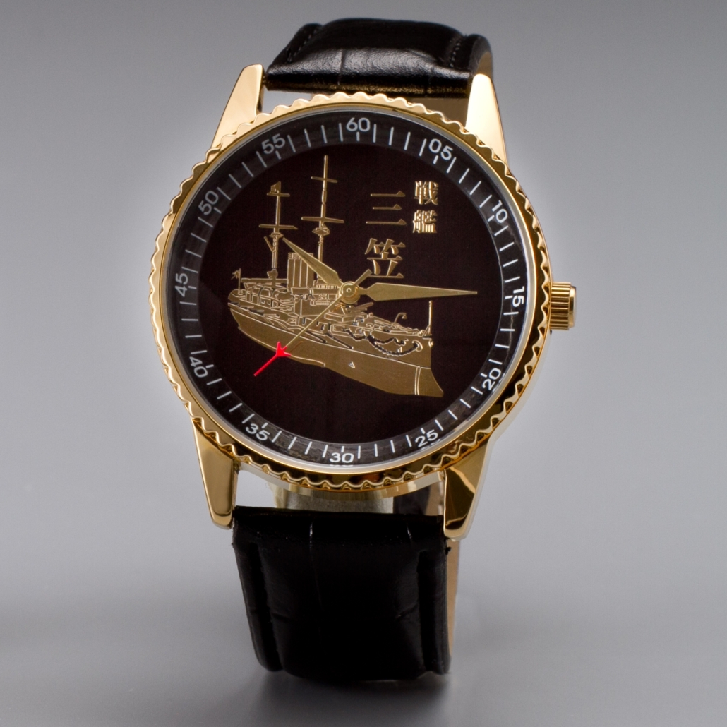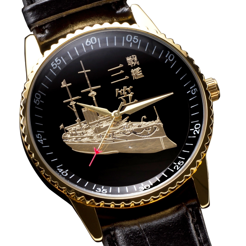 漆黒の文字盤にゴールドで三笠の姿が刻まれています。