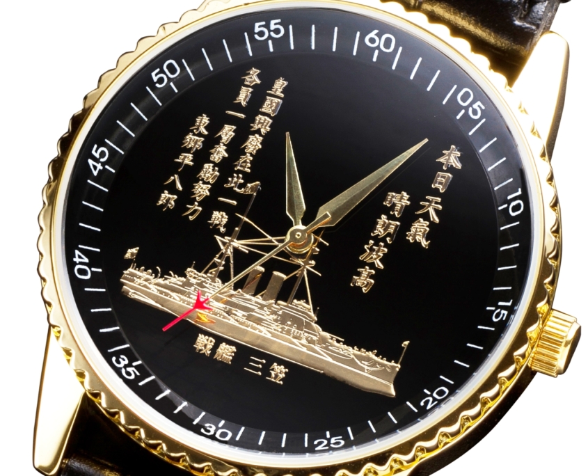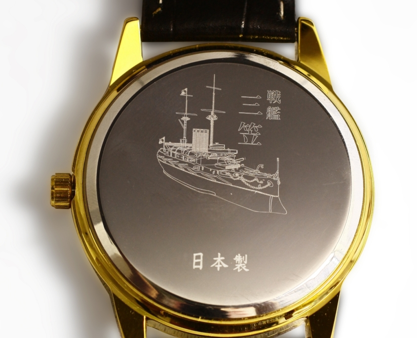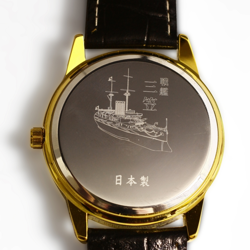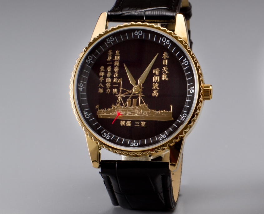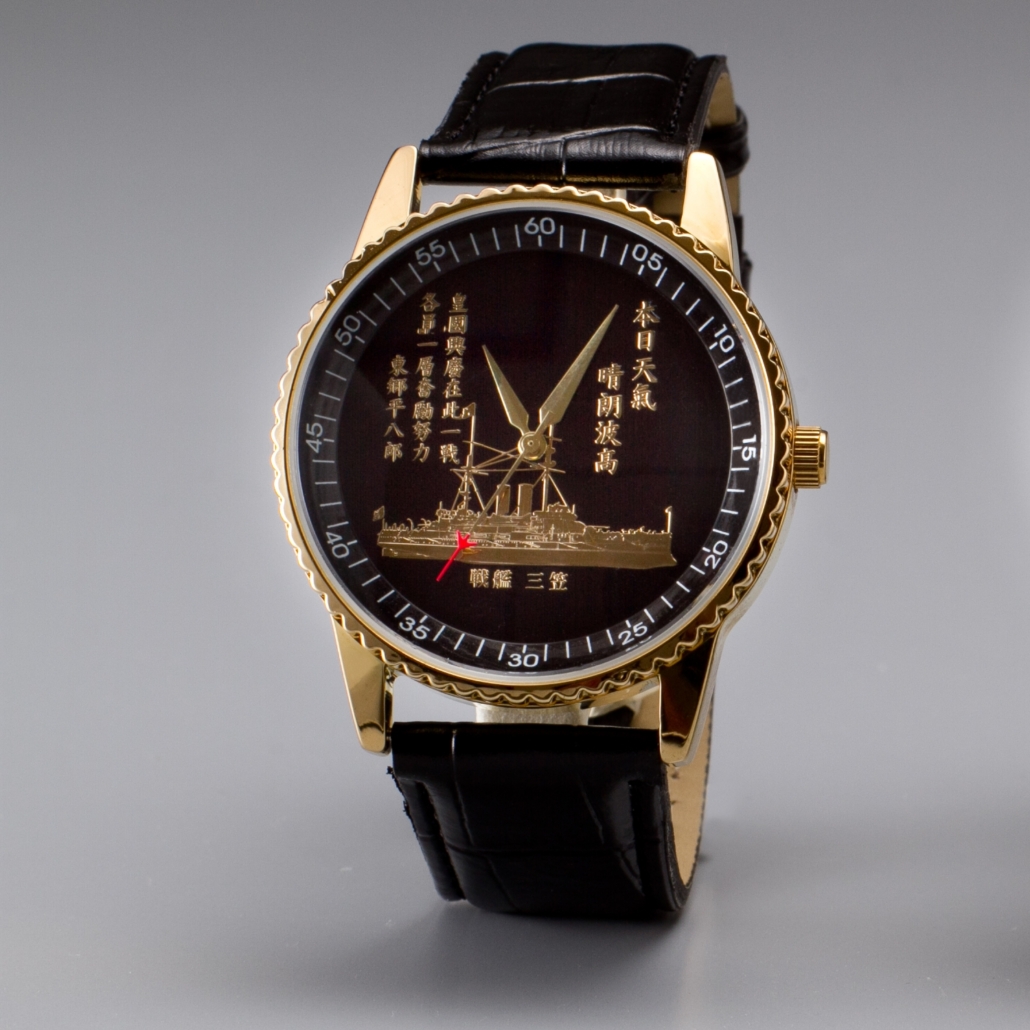 漆黒の文字盤にゴールドで三笠の姿が刻まれています。