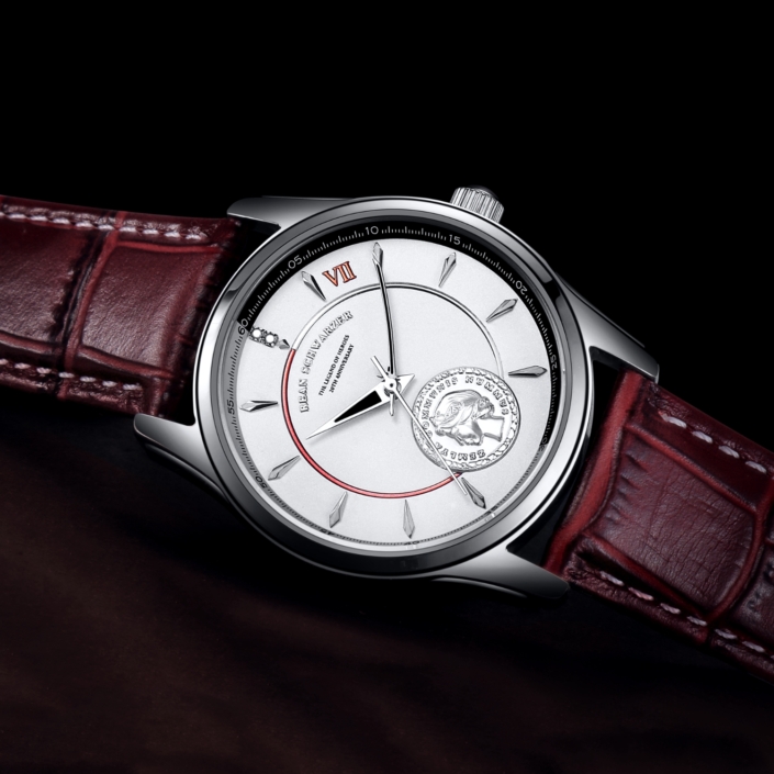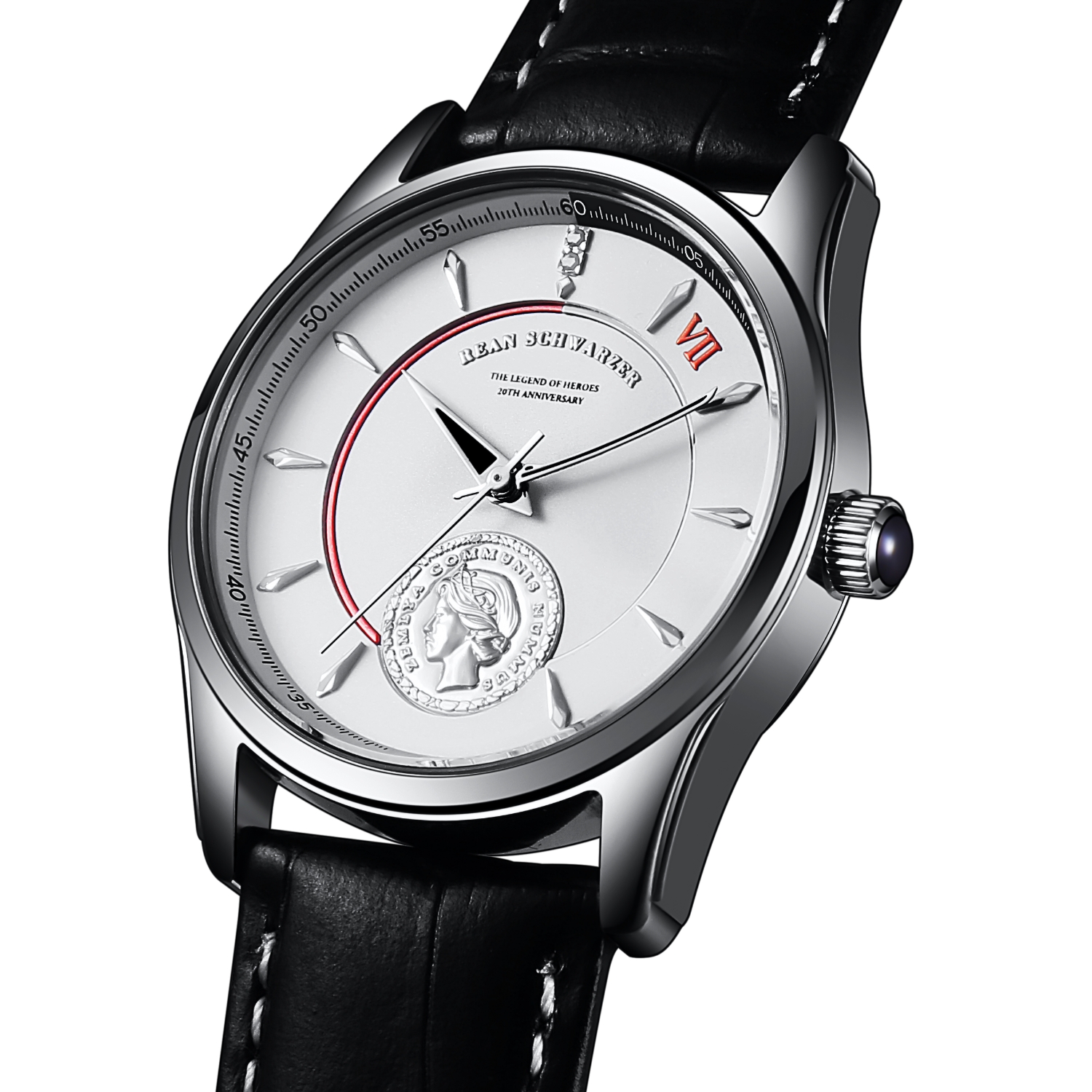 文字盤の6時位置には50ミラ硬貨が立体的な金属であしらわれ、Ⅶ組クラスメートの数と同じ、11本のインデックスがリィンを支えるように配置されています。