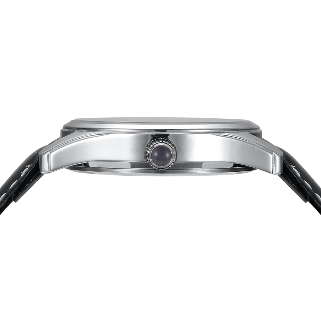 リィンをイメージしたホワイト、グレー、ブラック、ワインレッドのカラーがあしらわれた銀白文字盤の腕時計は、シンプルで普段遣いしやすいデザインに仕上げています。交換用のブラックレザーバンド付きでお届け。