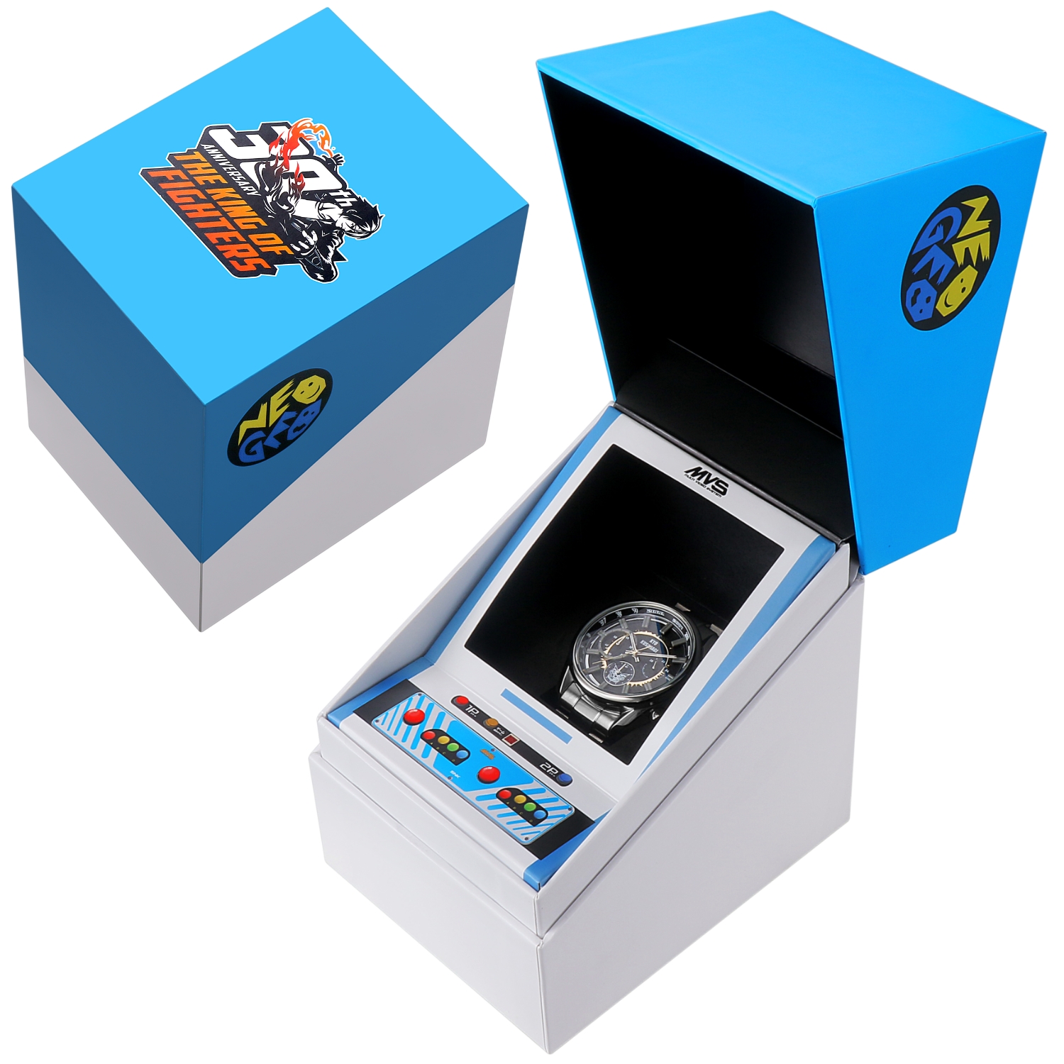 文字盤中央には、草薙 京の背中に描かれた日輪をモチーフにした金属パーツを配置。チャプターリングは学ランの襟元をイメージした造形を採用し、KOFシリーズ歴代ロゴが刻印されている。