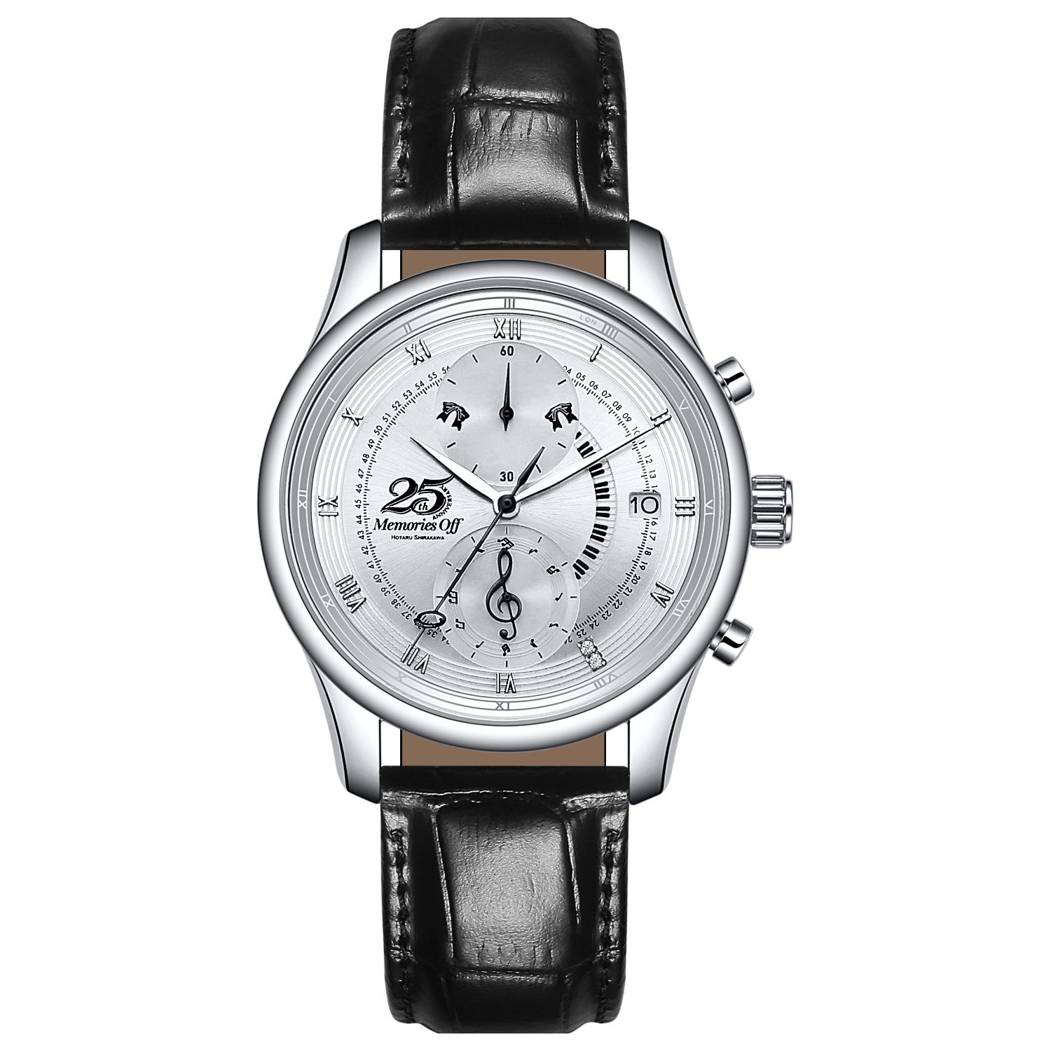 ロンドンで過ごす白河ほたるをイメージした腕時計。チャプターリングにはロンドン時間を配し、文字盤12時には髪飾りのシルエット、3時にはピアノ鍵盤、6時サブダイヤルには五線譜と音符を刻印。6時の針はト音記号を模したオリジナルデザインです。裏蓋には25周年公式ロゴ、歴代発売年、特別限定2000点のエディションナンバーを刻印しました。