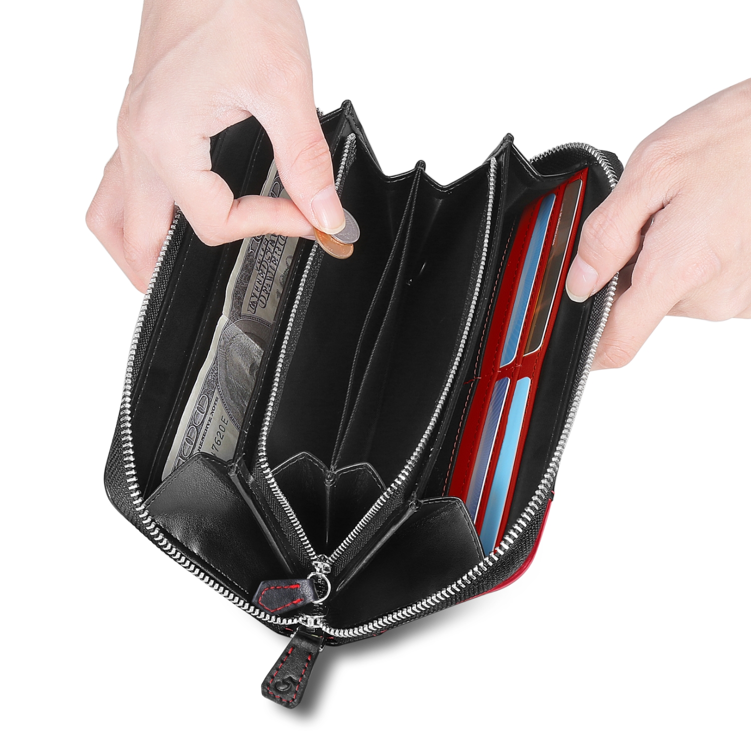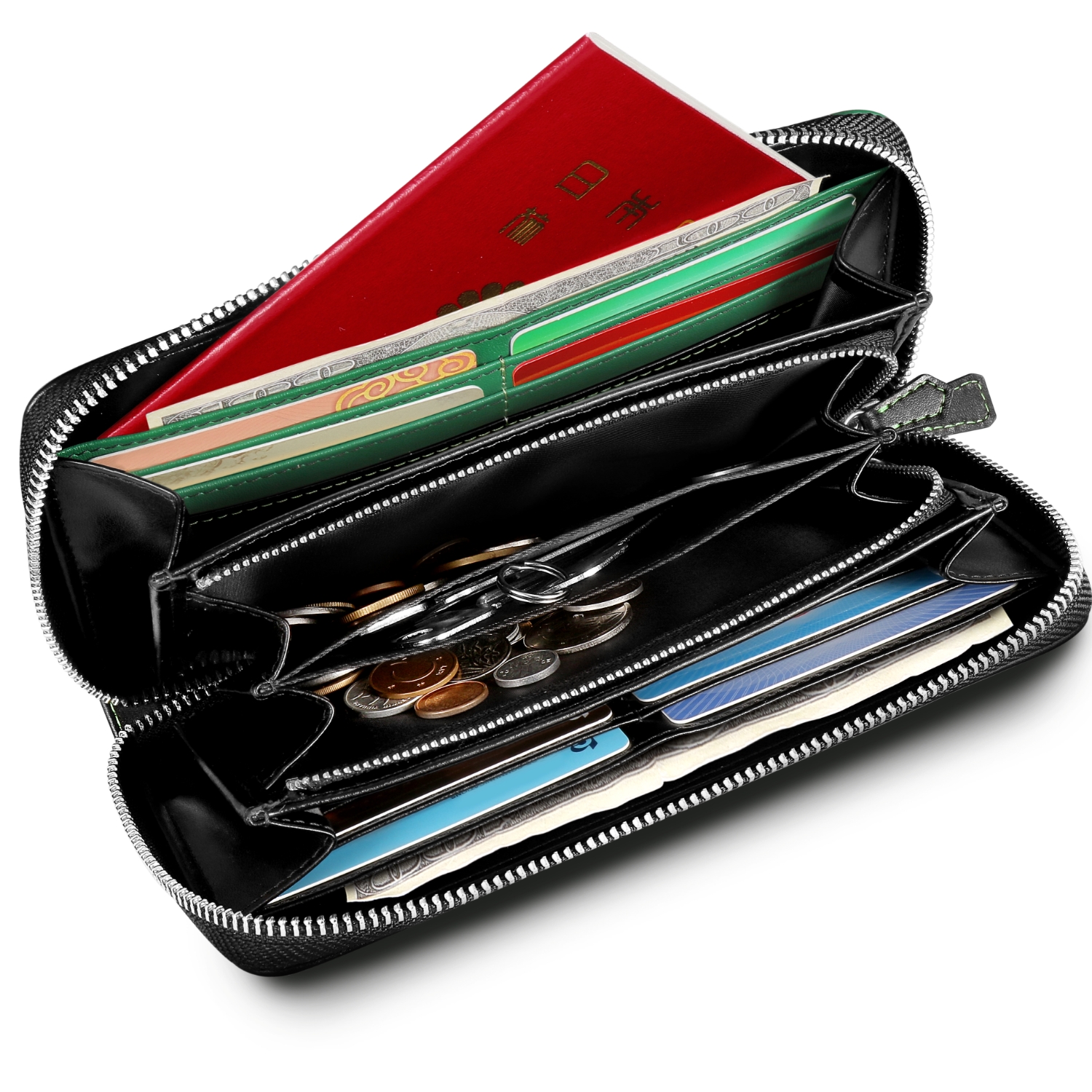 ガバっと開いて中身が一目で見渡せる利便性に加えて、沢山の仕切りと16枚ものカードを収納できるポケット、3層に仕切られた小銭入れ。デザインだけではなく、機能性も兼ね備えた実用性抜群の作り。