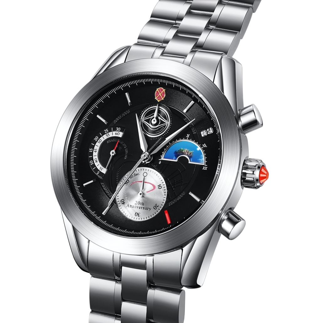 2005年に始まったTVアニメ「灼眼のシャナ」の物語から20年。アラストールのコキュートスや審判を象った意匠、贄殿遮那をイメージした秒針、紅世と現世が交差するムーンフェイズなど、随所に作品世界を刻んだアニバーサリークロノグラフが登場。特別限定生産2005点。