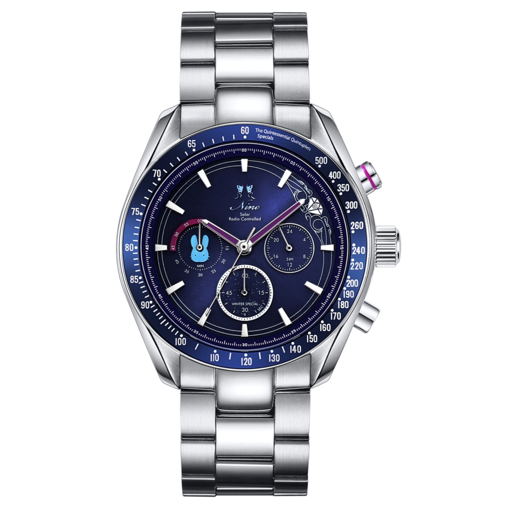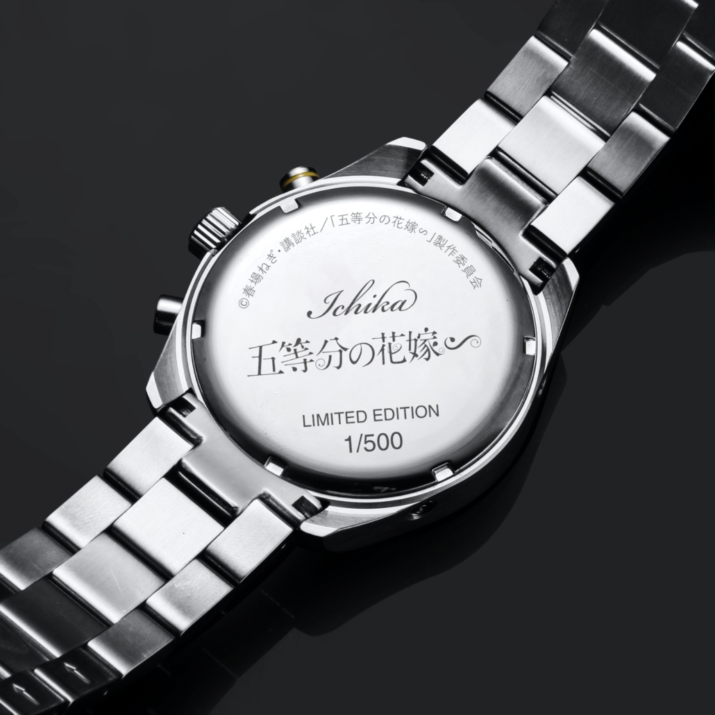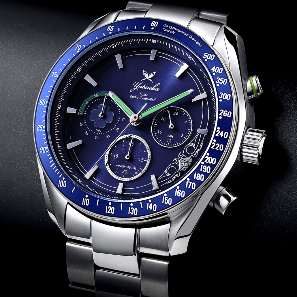 TVスペシャルアニメ「五等分の花嫁∽」の2023年冬限定モデルは、澄んだ冬の夜空にきらめく雪をモチーフにしたブルーダイヤルの腕時計。五つ子のモチーフがさり気なく組み込まれたデザイン、裏蓋には各500点の限定生産の証であるエディションナンバーを刻印。