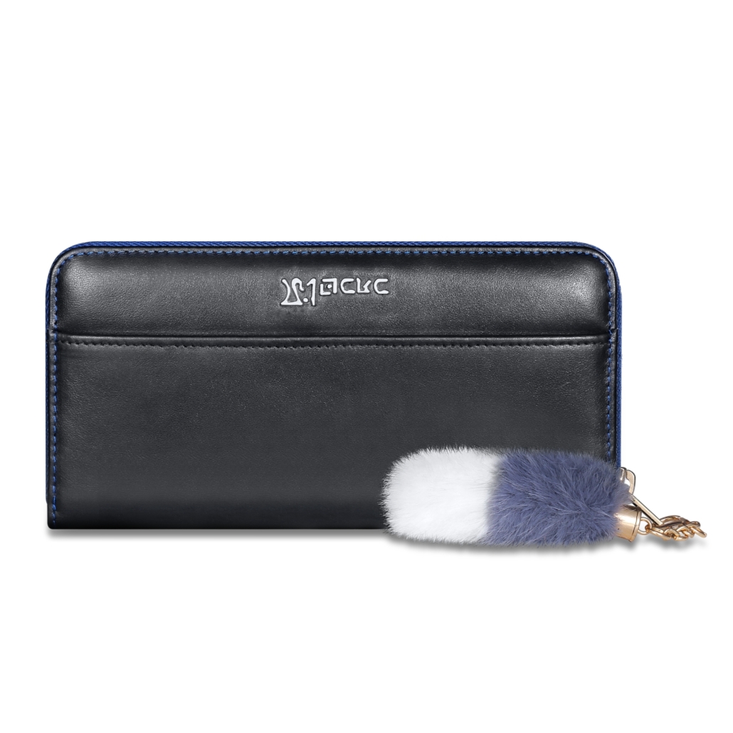 イタリアの名門「マストロット社」製レザーを使用した本体に、リムルの金属ネームチャームと便利なフロントポケットを配置。スライムリムルをモチーフに、爽やかなブルーのステッチとファスナー生地で軽やかな印象に仕上げました。裏面には革絞りで表現したリムルがひょっこり。さらに、ランガのしっぽをイメージしたフリンジや抗魔の仮面の刻印など、世界観を随所に感じるファン必携のデザインです。