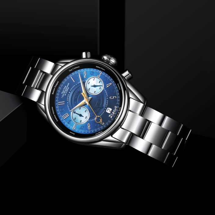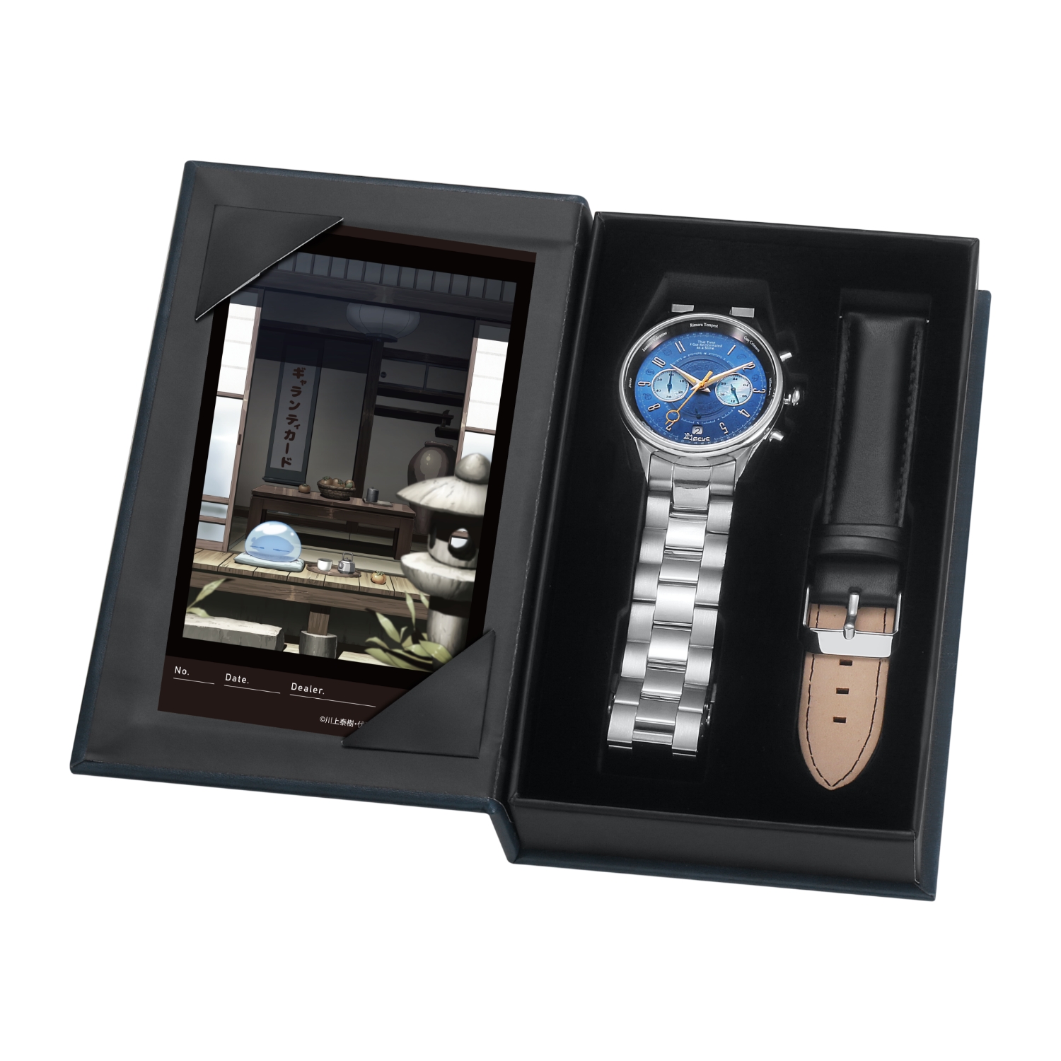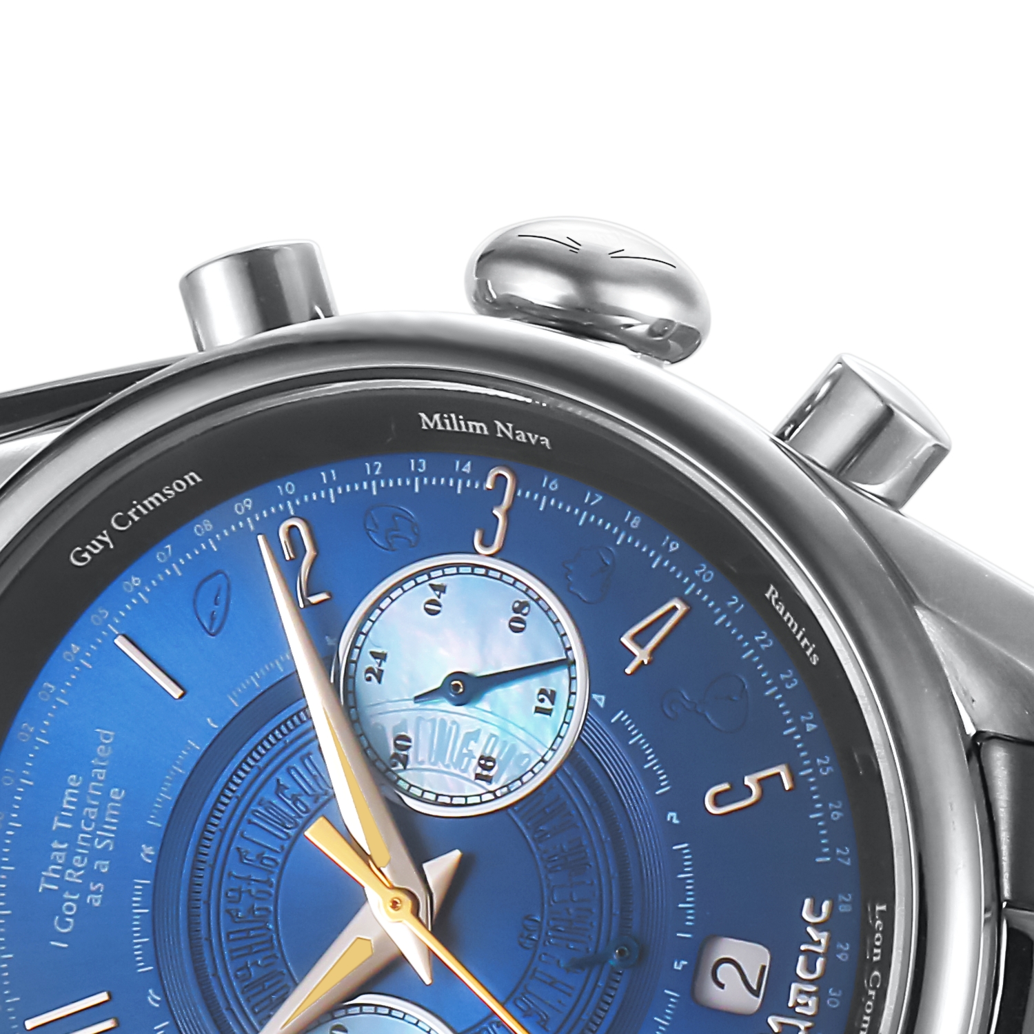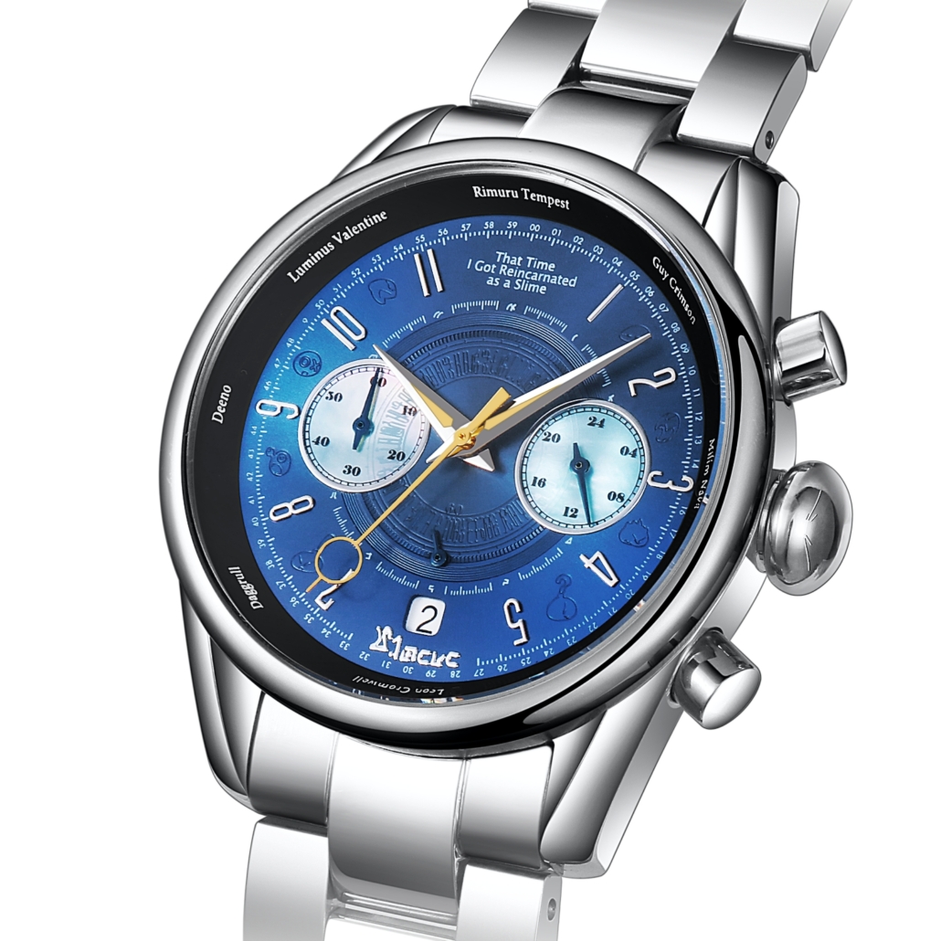 TVアニメ『転生したらスライムだった件』より、リムルをイメージしたクロノグラフ腕時計が登場。智慧之王 (ラファエル) 搭載。文字盤は、魔王リムルを象徴するダークブルーのサンレイ仕上げ。角度によって変化する光が、カリスマと包容力を併せ持つリムルの魅力を映し出します。